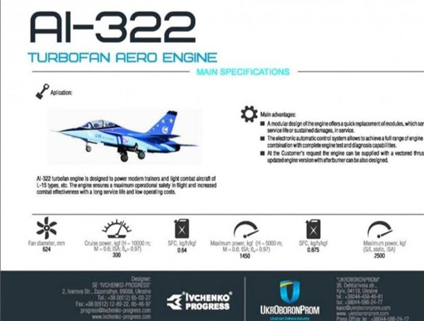 AI-322發(fā)動機由烏克蘭“伊芙琴科-進步”設(shè)計局研發(fā),由馬達西奇公司制造,這臺發(fā)動機就是原來的AI-222-25發(fā)動機的改進型,是一種無加力的中小推力小涵道比渦扇發(fā)動機,它的無加力推力是2.5噸。AI-322還有一個帶有加力燃燒室的型號,叫AI-322F,加力推力達到4.2噸,是為L-15的領(lǐng)先戰(zhàn)斗訓練型L-15B研發(fā)的,L-15B具備1.4馬赫的超音速飛行能力,可以承擔輕型戰(zhàn)斗機的部分功能。